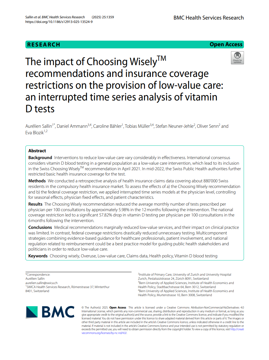 Sallin, Aurélien, Daniel Ammann, Caroline Bähler, et al. 2025. “The Impact of Choosing WiselyTM Recommendations and Insurance Coverage Restrictions on the Provision of Low-Value Care: An Interrupted Time Series Analysis of Vitamin d Tests.” BMC Health Services Research 25 (1): 1359.